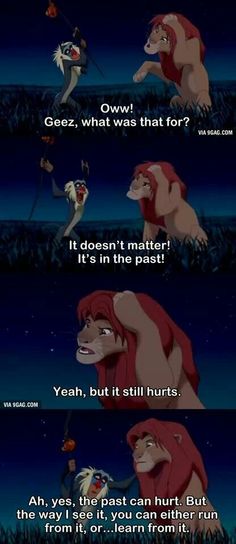 Like Rafiki said, the past can hurt but whether you learn from it or run from it is up to you….I’ve been running or rather avoiding my past but I think it’s time that I stopped running and learn from it… not gonna lie it’s quite difficult dealing with emotions or trauma’s that you’ve locked away for a long time and maybe I won’t be able to deal with it all today but I will one day. You just have to take it one day and one trauma/emotion at a time… đ